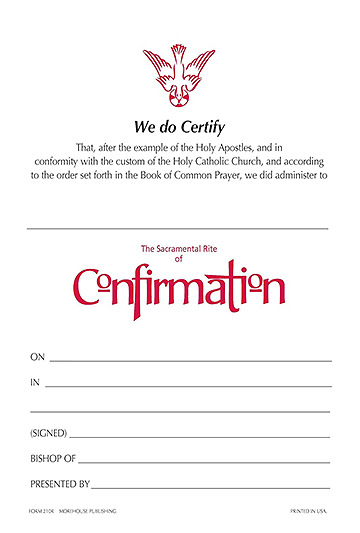 This certificate for the Rite of Confirmation is printed in red and black on cream colored stock. Certificates are offered in packs of 25 and include matching cream colored envelopes.